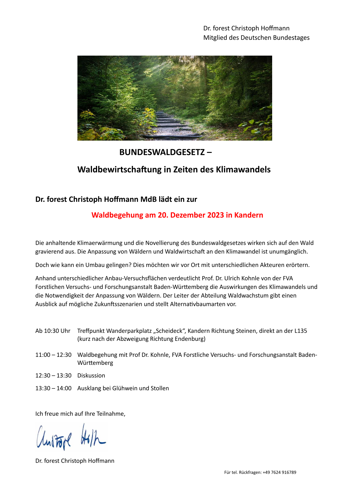 Die Forstbetriebsgemeinschaften wurden gebeten, die nachfolgende Information zu einer Waldbegehung mit dem Bundestagsabgeordneten Dr. Hoffmann an die Waldbesitzer weiterzuleiten. Nutzen Sie gerne die Gelegenheit zu einem Gespräch mit Dr. Hoffmann, der selbst promovierter Forstwissenschaftler ist.